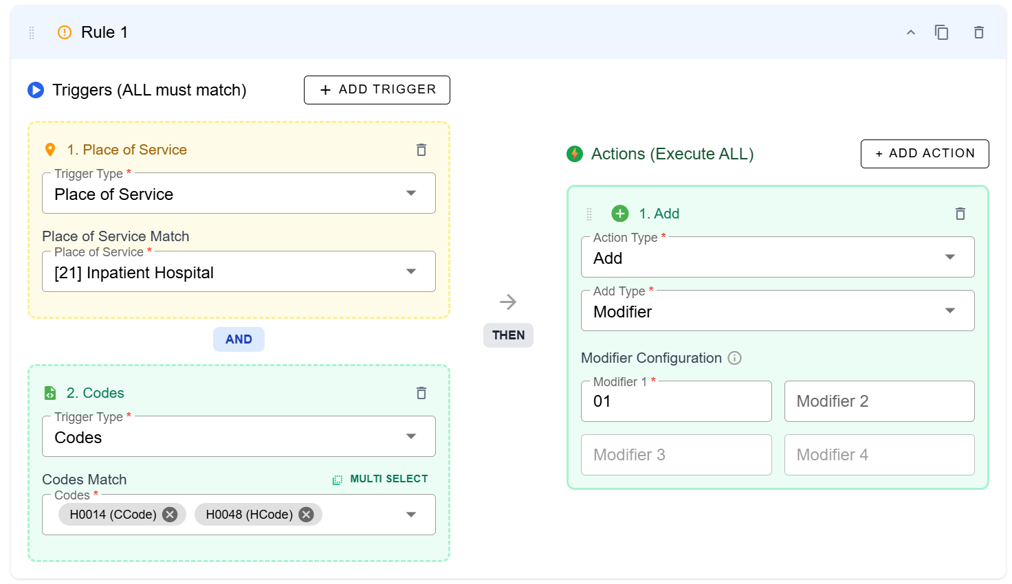 For example, you can add codes if you want to tie modifiers to specific codes. In this example, the modifier will be added to any items where Inpatient Hospital is set as the place of service AND the codes chosen in the rule trigger are present.