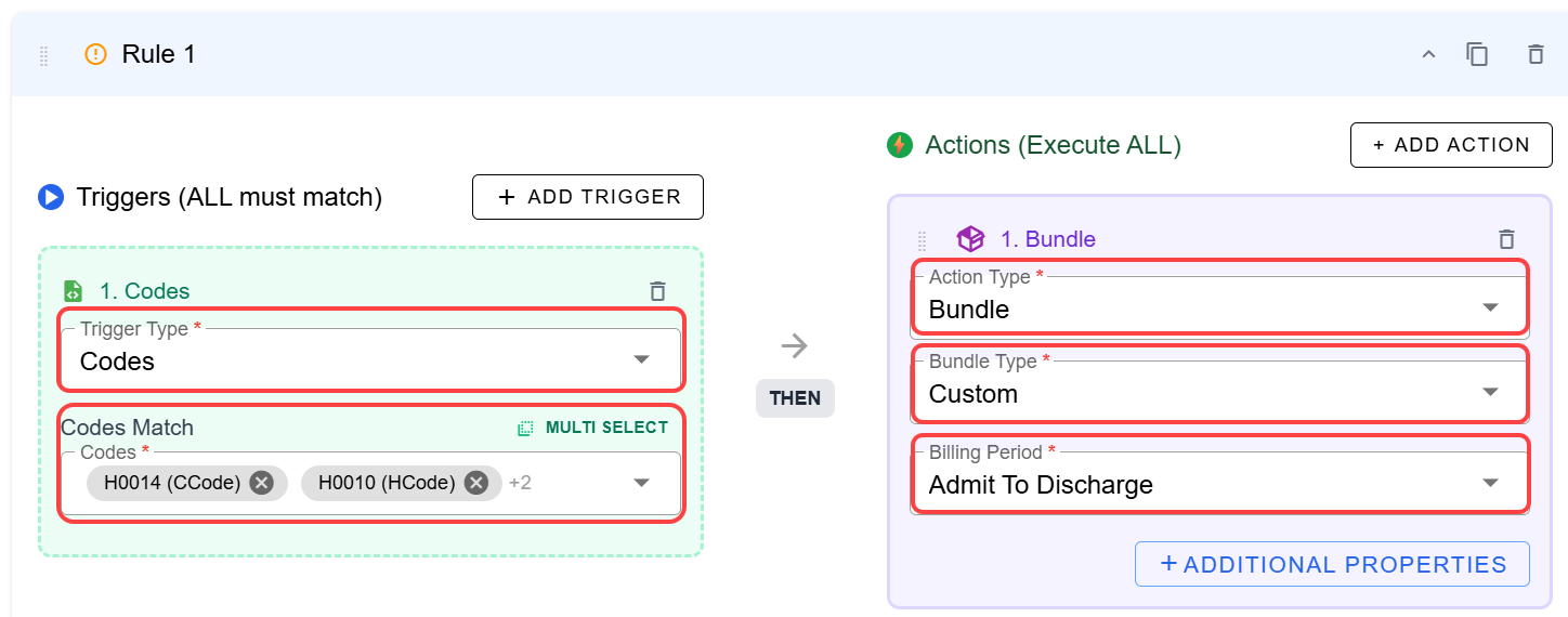 - Choose the triggers which will prompt the rule. In this case, we've chosen Codes and entered the matches. You can select one code or several, and can bundle codes related to different levels of service, if needed. Then we selected Bundle > Custom > Admit to Discharge.