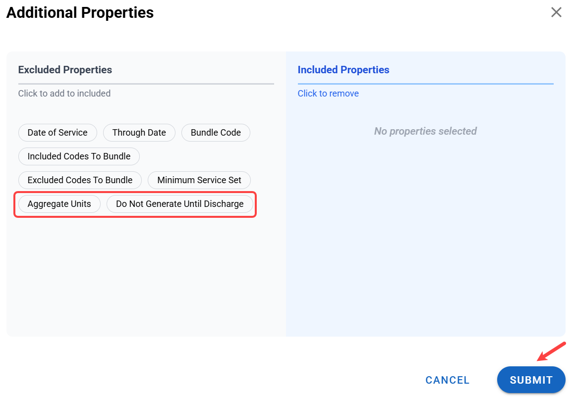 - You have several options under Additional Properties, but here we're interested in Aggregate Units and Do Not Generate Until Discharge. Select them and click Submit