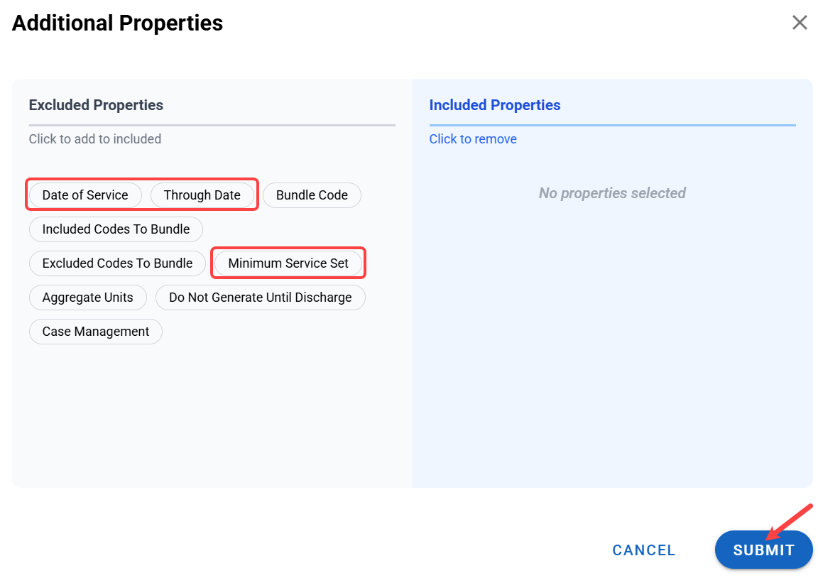 - You have several options under Additional Properties, but here we're interested in Minimum Service Set, Date of Service, and Through Date. Select them and click Submit.