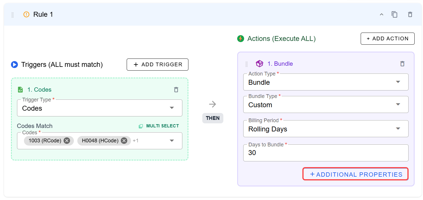 - Choose the triggers which will prompt the rule. In this case, we've chosen Codes and entered the matches. You can select one code or several. Then choose Bundle > Custom. In this case, we've chosen Rolling Days for Billing Period and typed in 30 for Days to Bundle, though you can choose Daily, Weekly, Monthly, and Admit to Discharge as well.