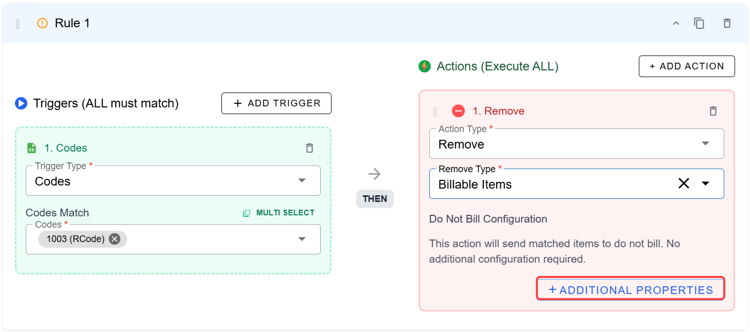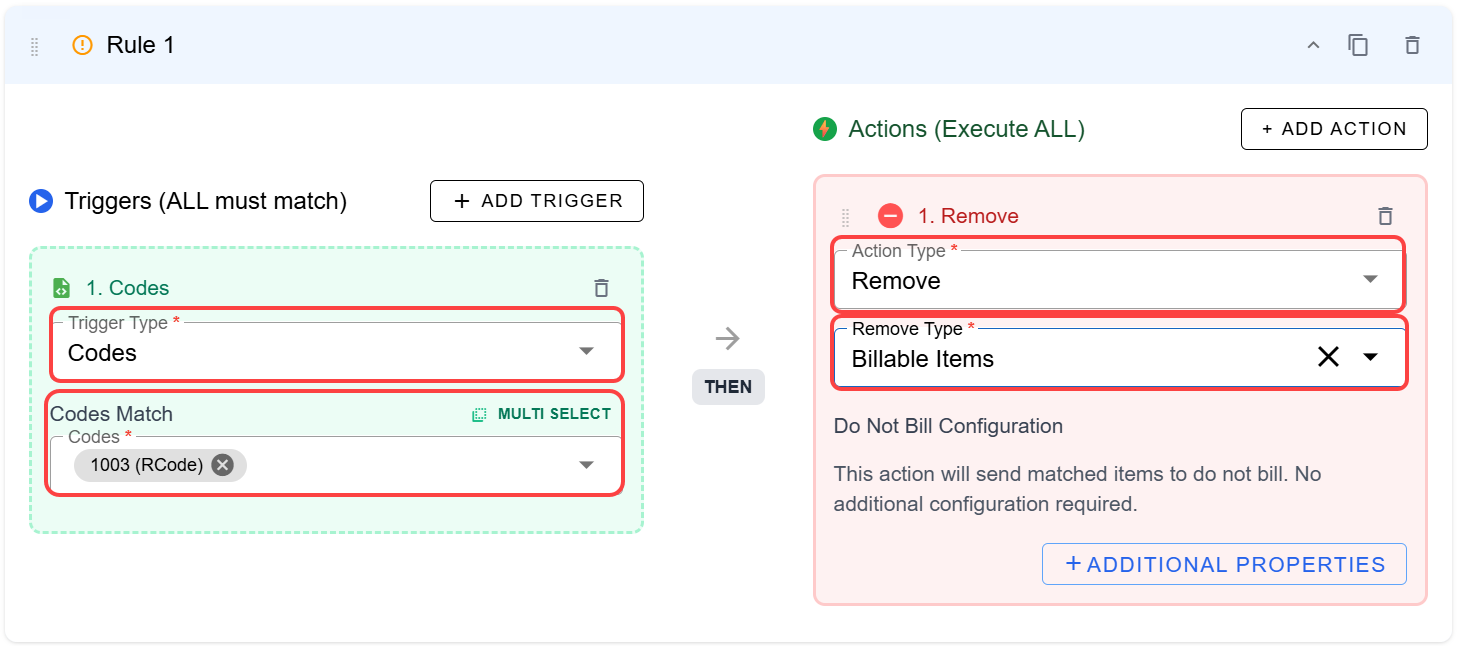 Choose the triggers which will prompt the rule. In this case, we've chosen Codes and entered the matches. You can select one code or several. Then choose Remove > Billable Items for the Action.