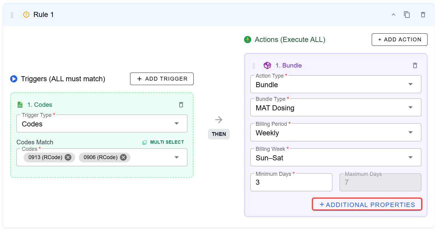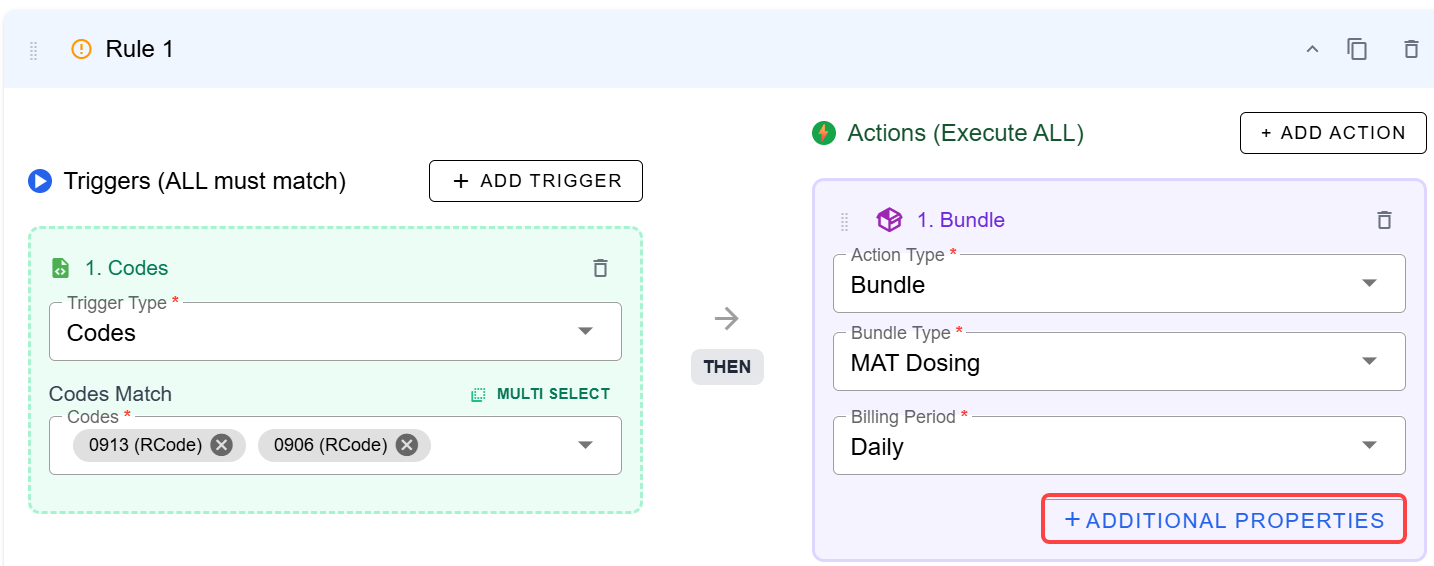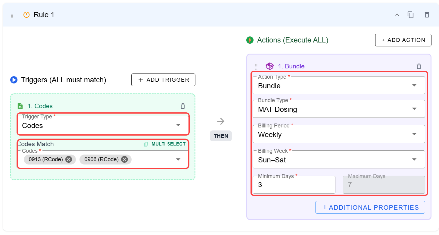 Choose the triggers which will prompt the rule. In this case, we've chosen Codes and entered the matches. You can select one code or several. Then chose Bundle > MAT Dosing. Pick the desired billing period