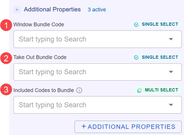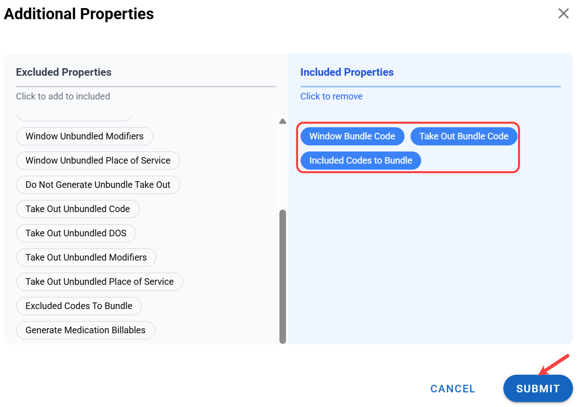 - You have several options under Additional Properties, but here we're interested in Window Bundle Code, Take Out Bundle Code, and Included Codes to Bundle. Select them and click Submit.