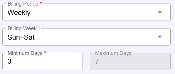 - If you pick Weekly, you can choose which day starts the billing week, and the minimum number of days that can be bundled.