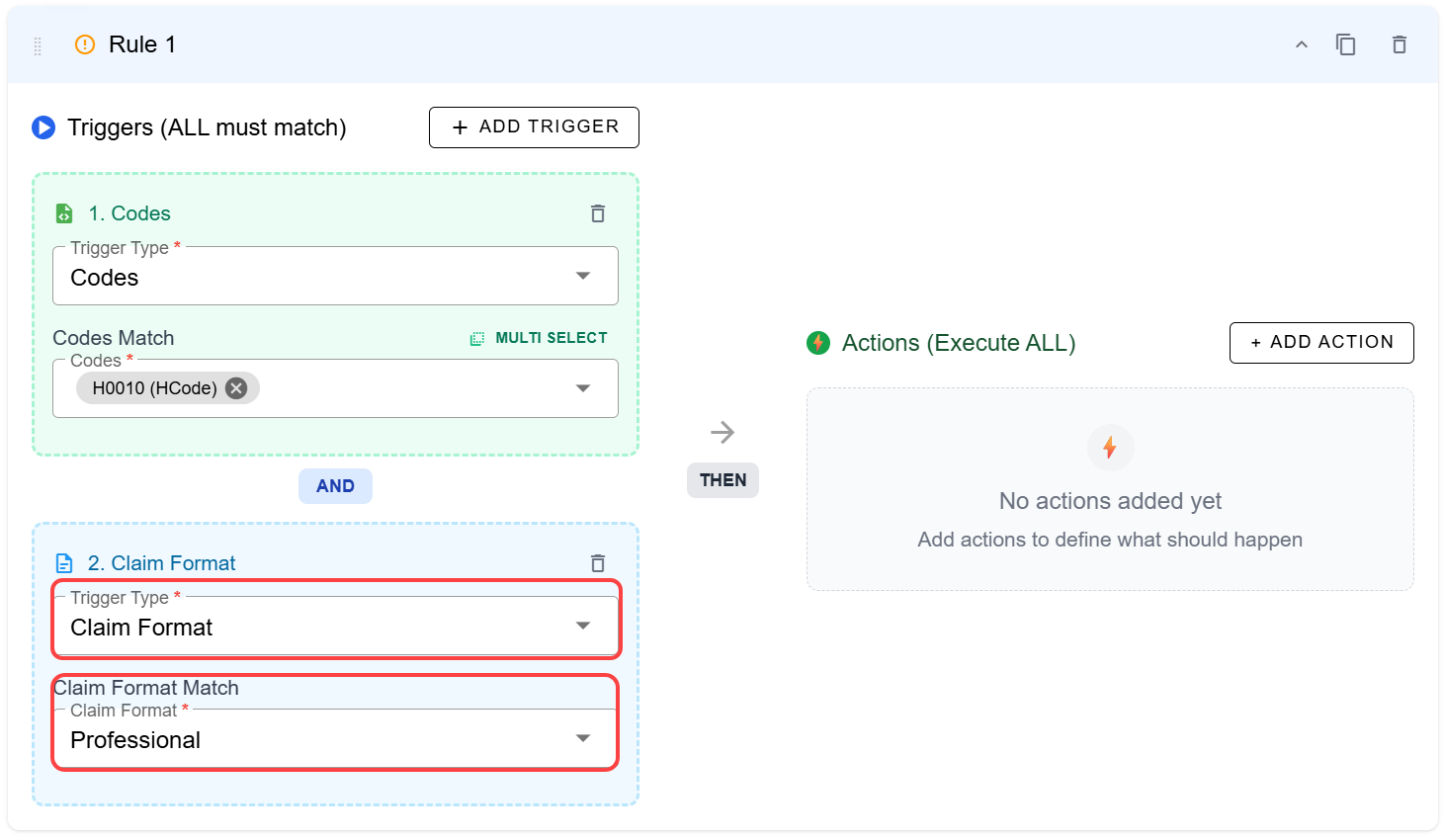 - Then click + Add Trigger again, choose Claim Format, then select the desired format from the drop-down.