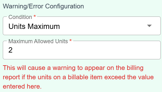 Units Maximum: Choose this option to add a warning message if the units on the billing item exceed the value entered in the Maximum Allowed Units field (here, 2).