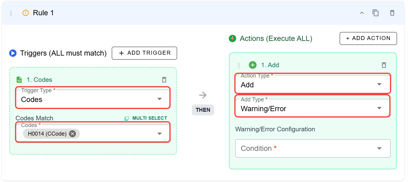 To add warnings or errors to a billing item, add the desired triggers (here we have chosen Codes). Then click + Add Action and choose Add and Warning/Error.