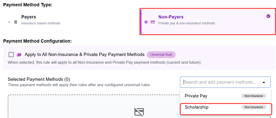 - To begin, make sure Non-Payers is selected as the payment type, and that a payment method is chosen. We are choosing Scholarship in this example.