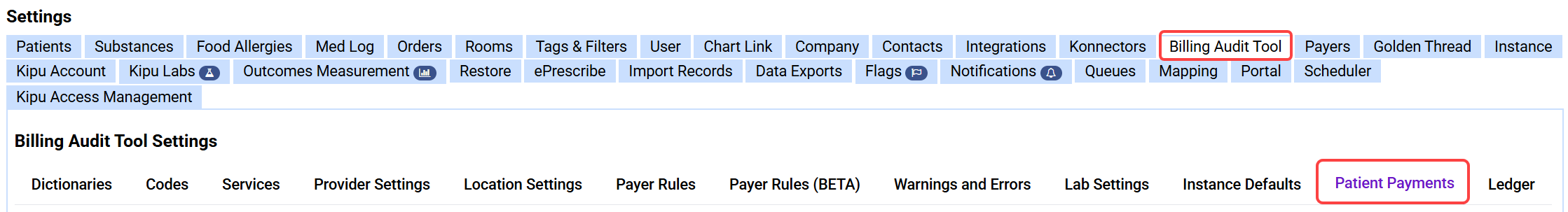 Go to Settings > Billing Audit Tool > Patient Payments > Payment Methods.