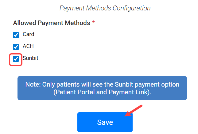 - Sunbit is enabled by default so you can begin offering patient financing immediately with no additional setup. This allows patients to access flexible payment options right away and helps improve collections without added operational effort.