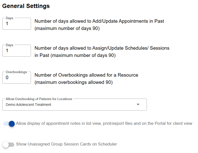 Number of days allowed to Edit Appointments in the Past: Use this field to indicate how many days into the past users are able to edit past appointments. The maximum number is 90 days.