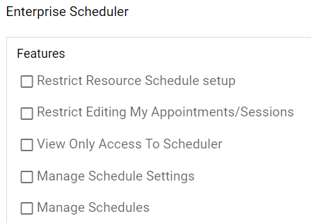 - Restrict Resource Schedule setup: Users with this permission can only view their Resource Schedule, they will not be able to edit it. Super Admins and users with the Manage Scheduler Settings permission will have to make any necessary additions and changes.