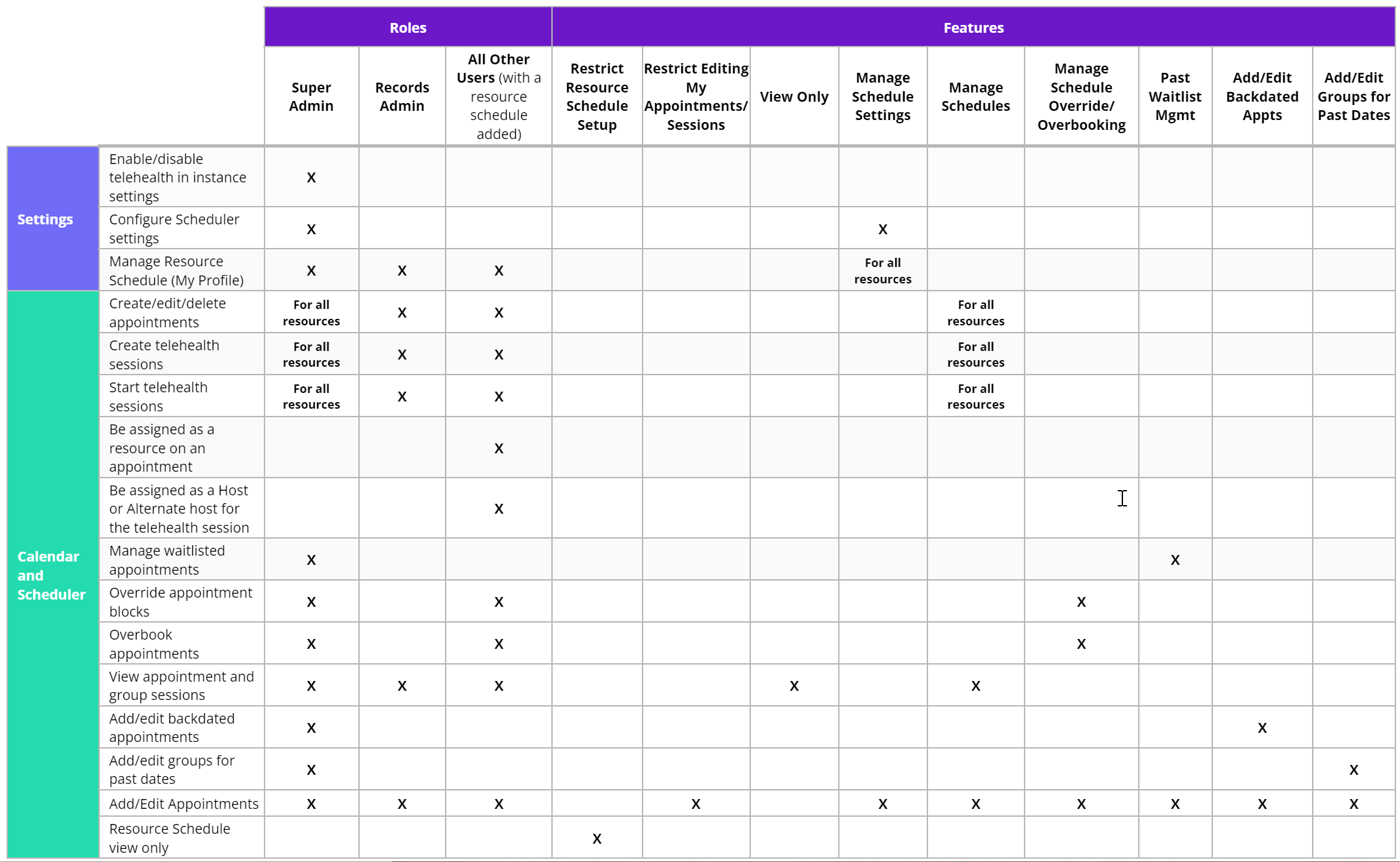 The following table provides information on access based on role and feature. Resources can only create and manage their appointments and users with view-only access will be able to view but not otherwise interact with all Scheduler appointments.